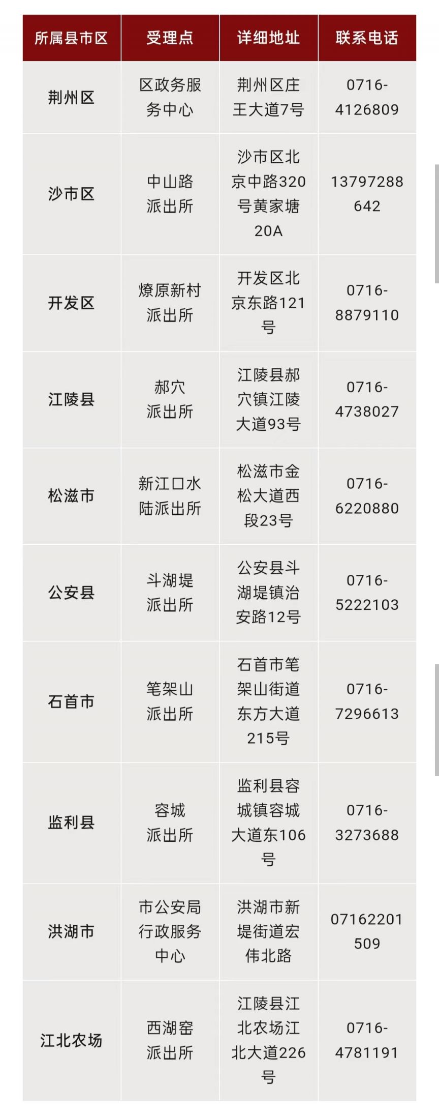 3. "荆州市公安局荆州区分局出入境管理大队" - 地址:荆州市荆州区荆中路1号 - 电话:0716-8231234 - 服务内容:港澳台居民居住证申请、换发、补发等