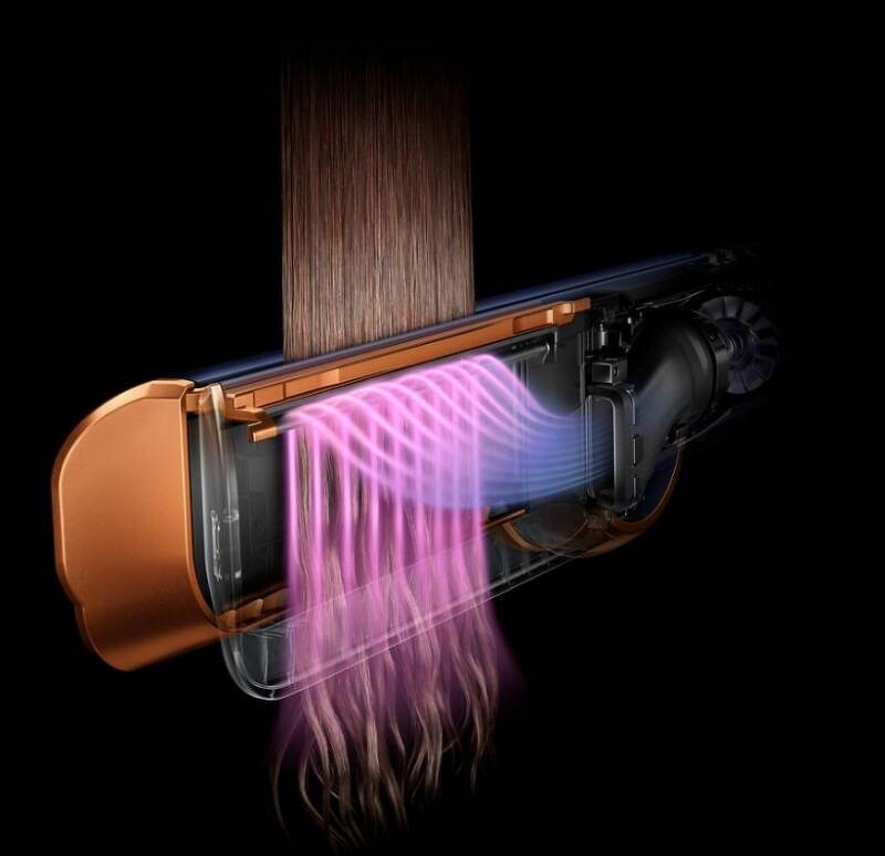 用传统直髮器最怕就是夹伤头髮,及过热令到髮丝乾燥受损。Dyson Airstrait™二合一吹风直髮器有别传统直髮夹,採用无热面板技术,直髮器上装有左、右各一扩散装置,透过细孔加速吹送两排高速气流,45度夹角向下吹出并形成拉力顺直髮丝,打造出具顺滑光泽的秀髮。